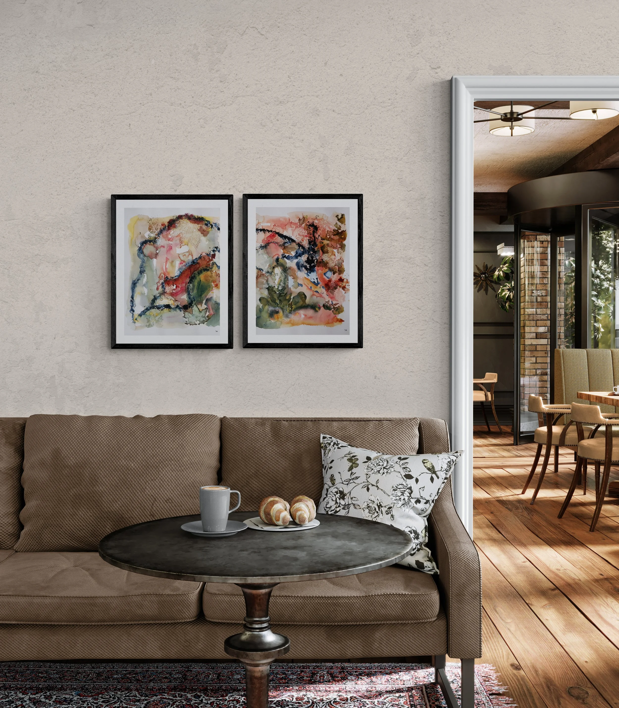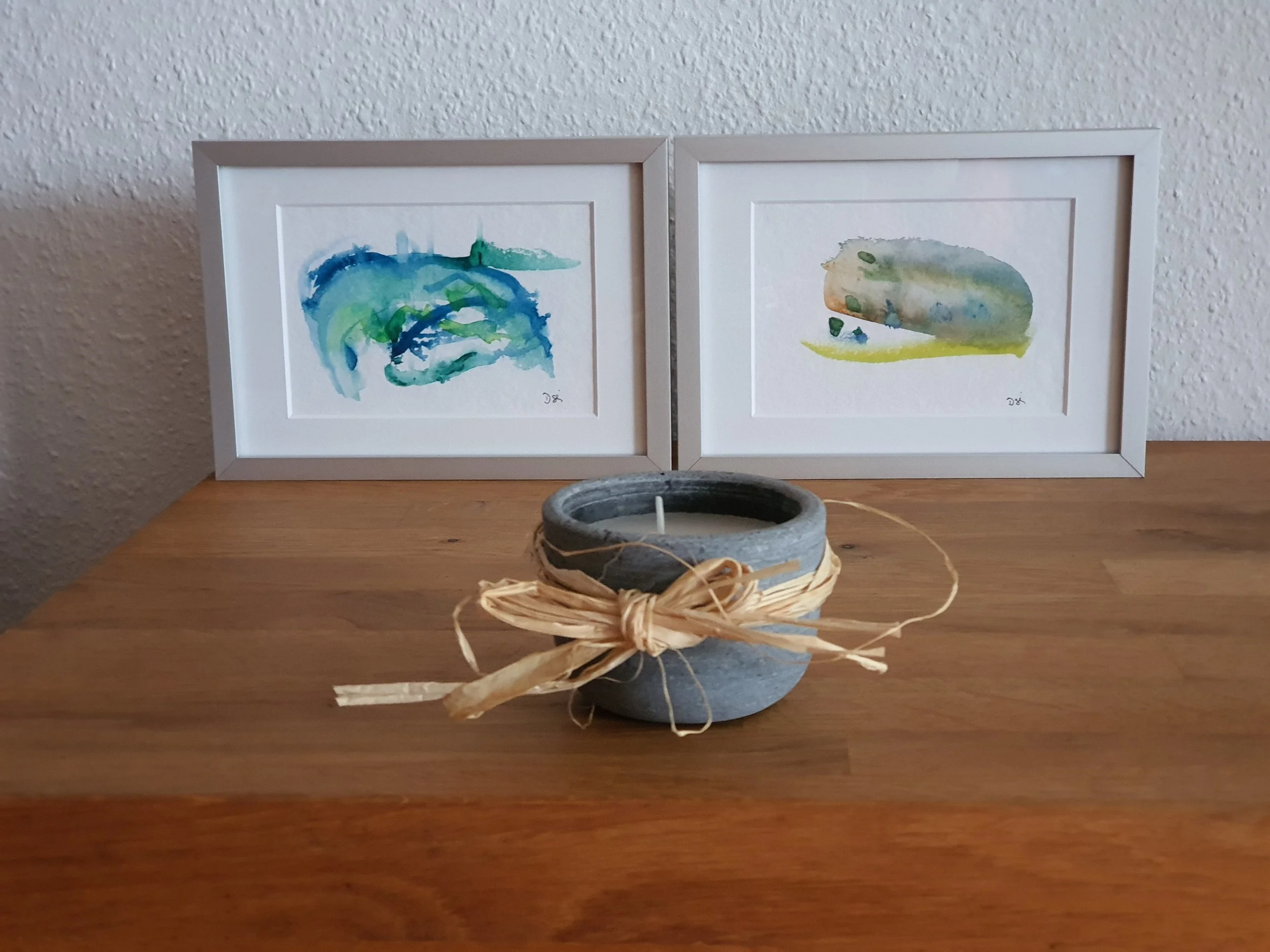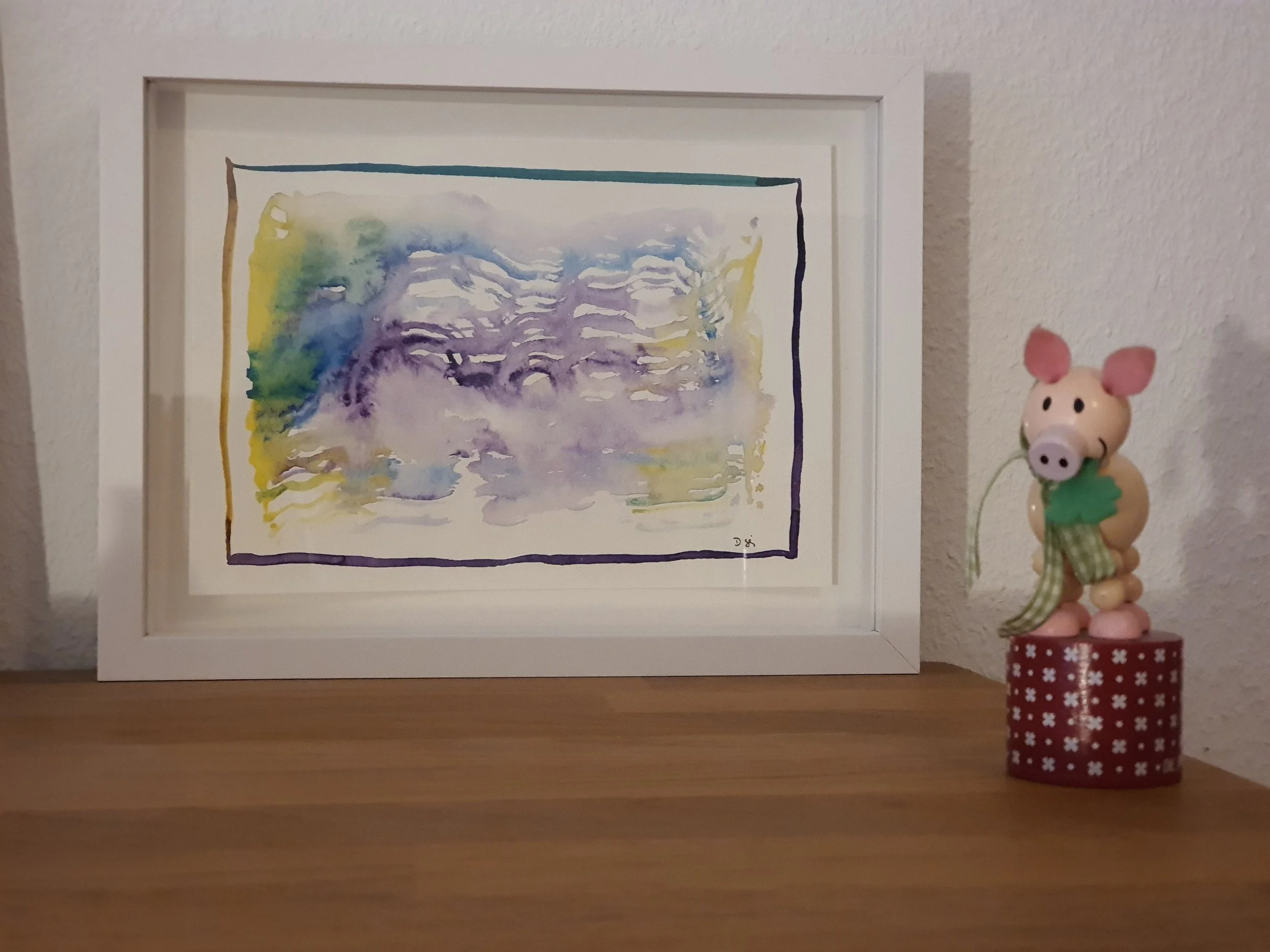 Nach Jahren voller Übungen und Weiterbildung startete ich im Februar neu – diesmal mit Aquarell. Ich liebe das Fließen der Farben, fern von pastelligen Stillleben oder konkreten Formen. Es entstanden zuerst kleinere, dann mutigere Formate, es folgten Blätterdrucke und Mixed-Media-Projekte, die Geschichten erzählen – inspiriert vom Moment, der Natur und der Freude am Fließen der Farben.