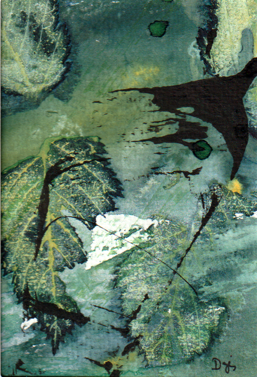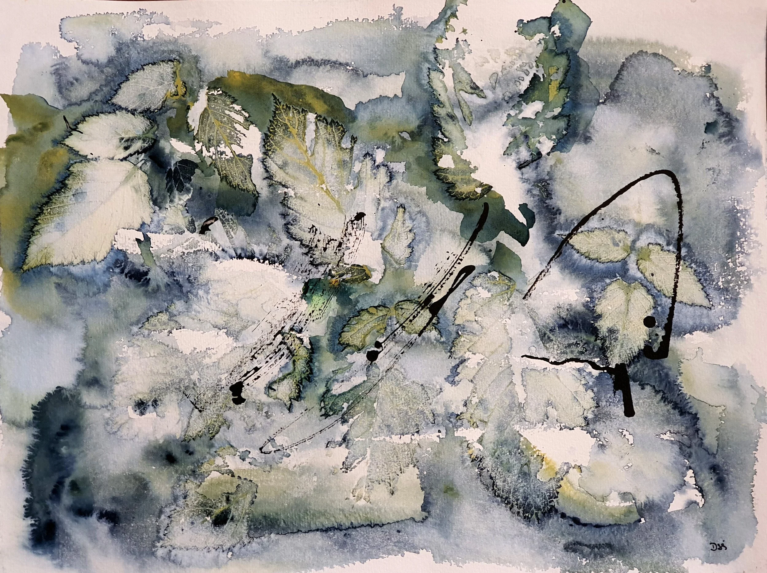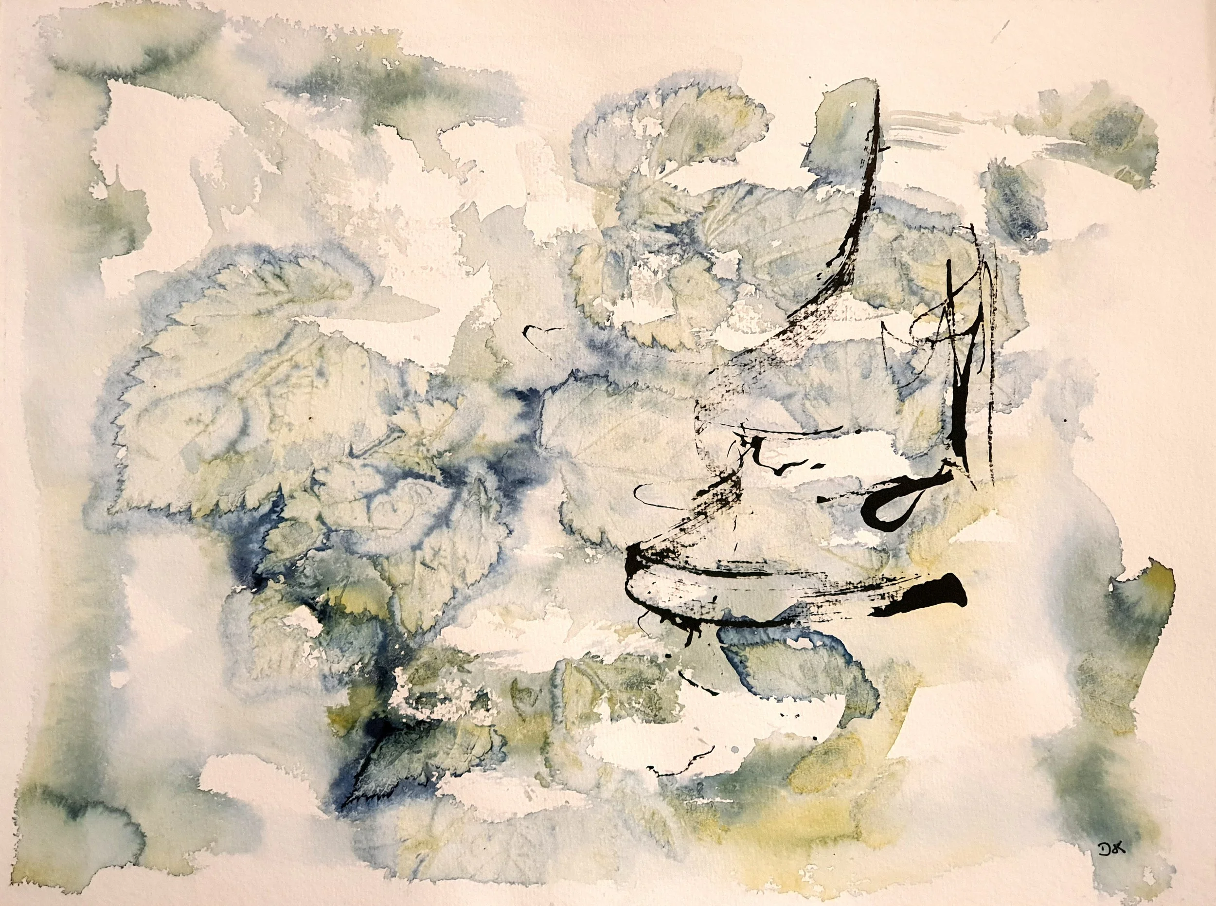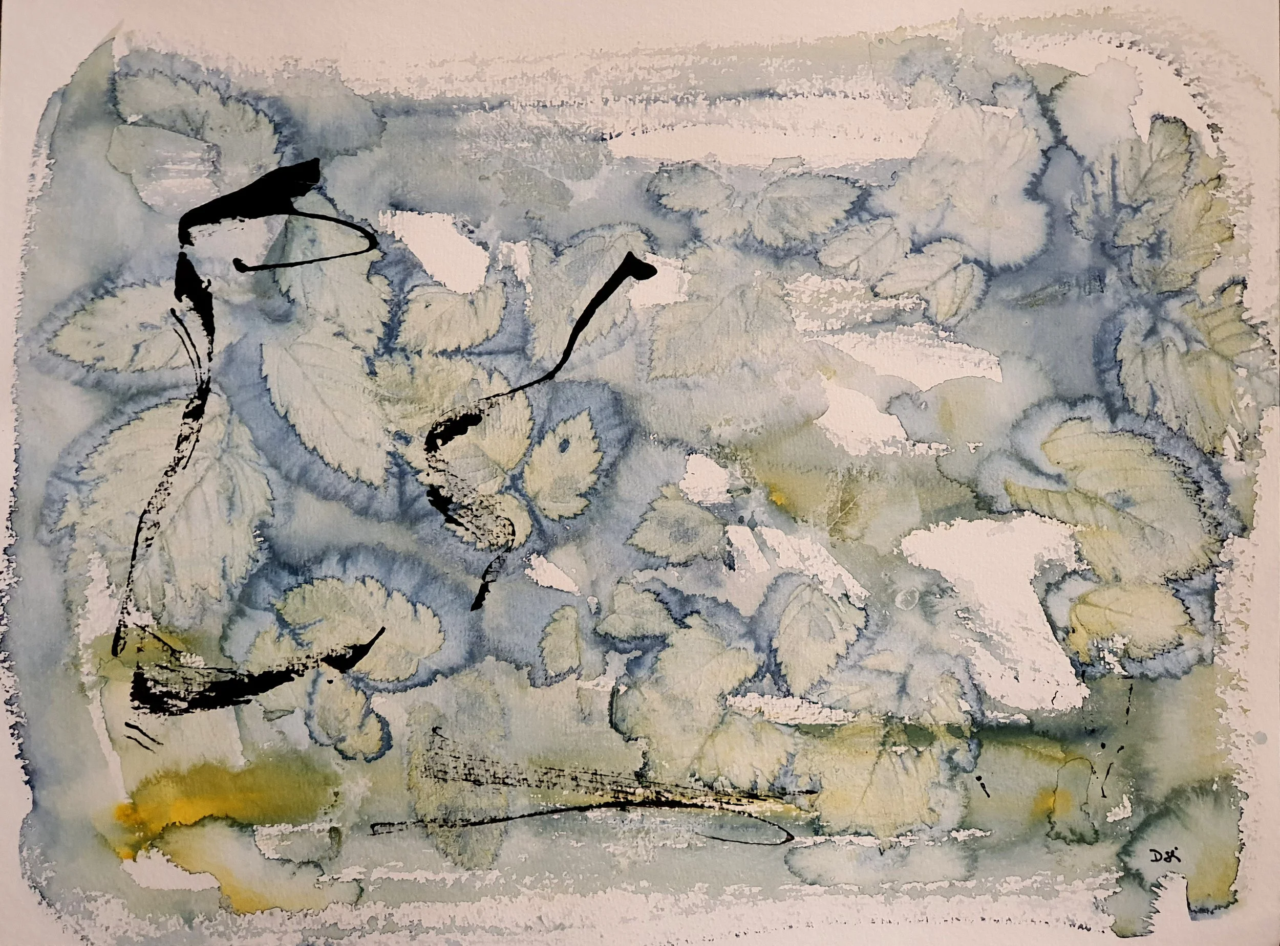 Diese Bilder entstanden im Zusammenspiel von Farbe, Blatt und Linie. Blau und Gelb fließen erdig, dicht und konzentriert über nasses Papier. Die Blätter des Christophskrauts hinterlassen ihre Spuren – natürlich, frei, unvorhersehbar. Traumverhangen.