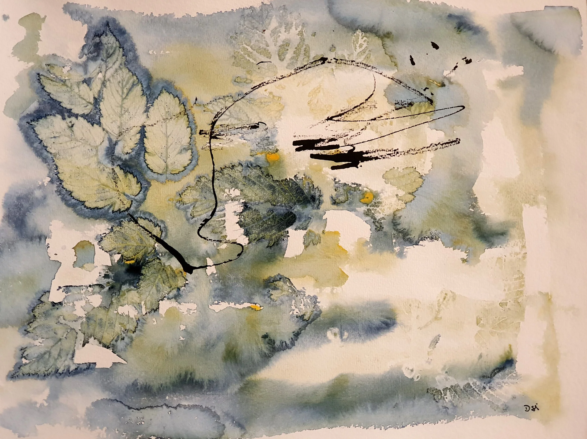 Aus diesen Abdrücken wächst Struktur: Blattränder treten hervor, Tuschelinien fügen sich ein – nicht als Kontrast, sondern als Verankerung. Aufgetragen mit einem Ast, geben sie den Bildern Halt – so wie Vertrauen dem Leben Halt gibt.